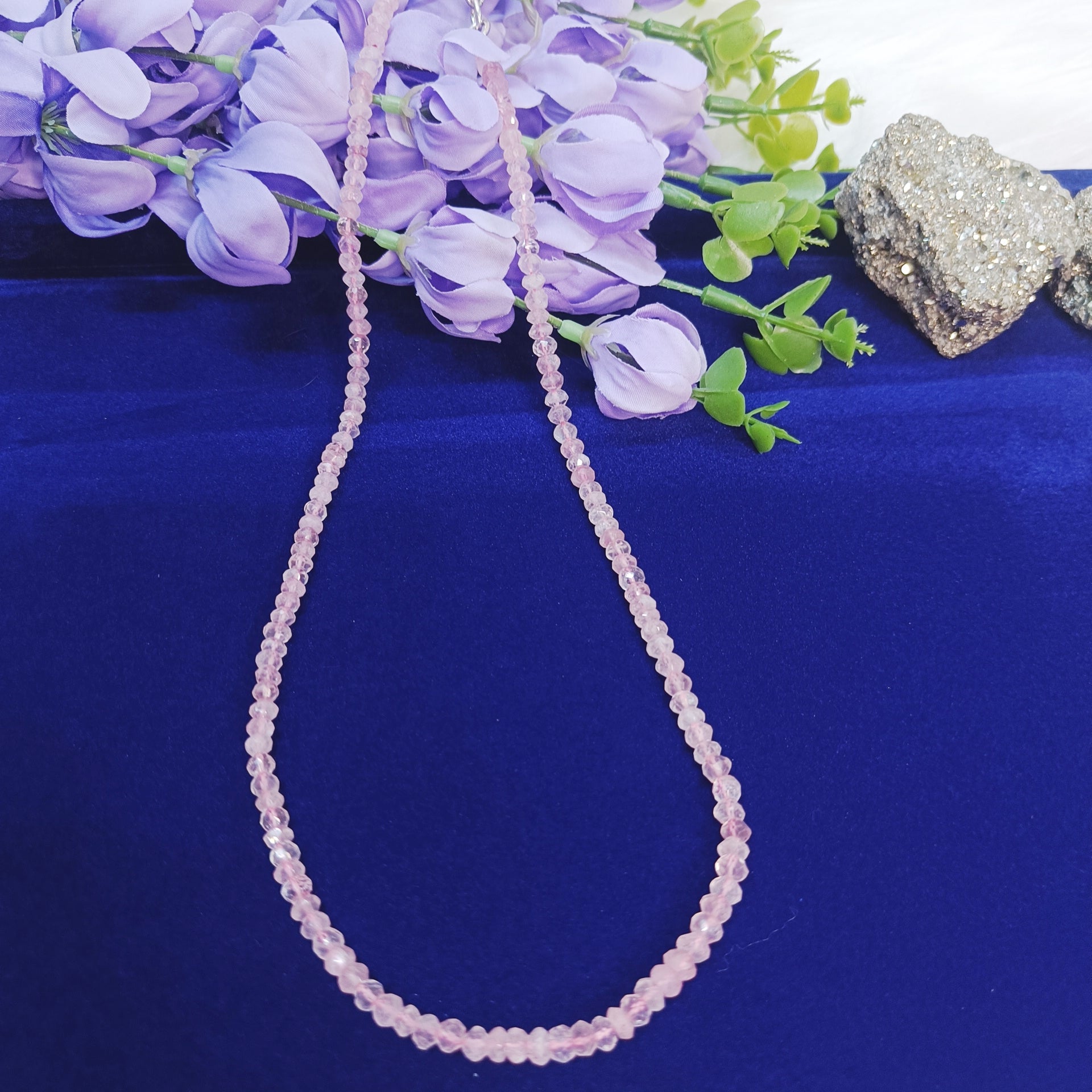 Soft, elegant, and full of love, our Rose Quartz Faceted Beads Necklace is handcrafted with sparkling 3mm natural faceted rose quartz beads. Its gentle pink glow makes it a timeless, sustainable accessory that complements any outfit while radiating the nurturing energy of love and harmony.